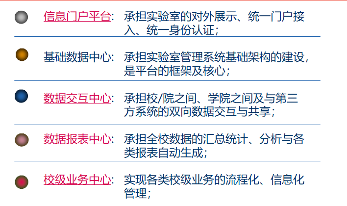 包含服務平臺基礎架構:建制實驗室信息、教學課程信息、儀器設備信息、人員信息等基礎信息的搭建;發布實驗室資源現狀、儀器設備信息、排課信息、教學課件、教學成果、規章制度、收費信息及用戶登錄入口。 |